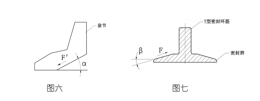 當擰緊球形螺栓,兩套節給T型環(huán)的筋兩個(gè)夾緊力F,此時(shí)間隙h消除,由于α>β,兩套節的斜錐面就迫使T型臂的唇向內收縮,這就形成初始密封,當內壓p上升,T型臂出現向上的F力,套節錐面產(chǎn)生一個(gè)反作用力F’,這樣壓力越高,鎖緊力越大,2004年我司就將其定義為“高壓自緊式法蘭zy-loc”。