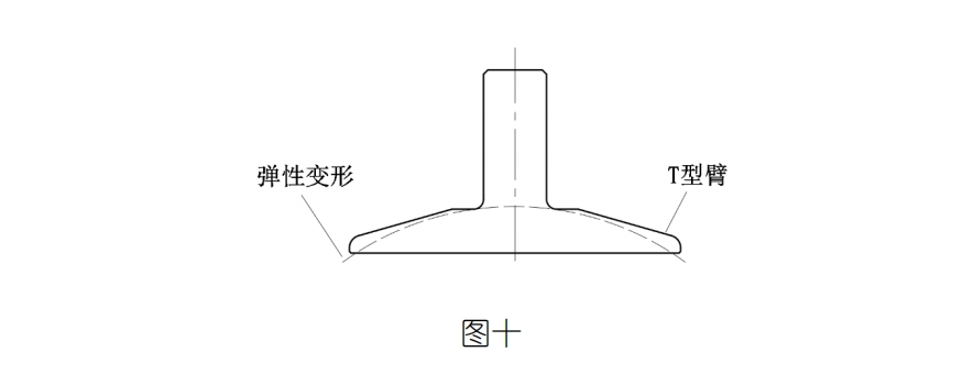 iii螺母底部是球面,卡套的接觸面也是球面,這樣螺母有可以自動(dòng)調直螺栓的功能,螺栓力使套節在360°方向與T型臂均勻受力,所有外力都被足夠剛度、強度的卡套阻擋在外,這就是真正無(wú)泄露的原因所在!T型臂結構設計時(shí),全部按彈性變形設計,如圖八、圖九: